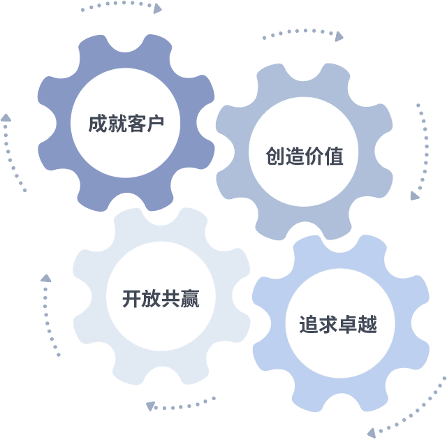 成就客户是一切决策的出发点,,,创造价值是衡量所有工作的标准,,,,追求卓越是我们做事做人的态度,,,,开放共赢是我们的格局也是最终的结果。。价值观的齿轮环环相扣,,,推动着组织里的每个人不断向前。。